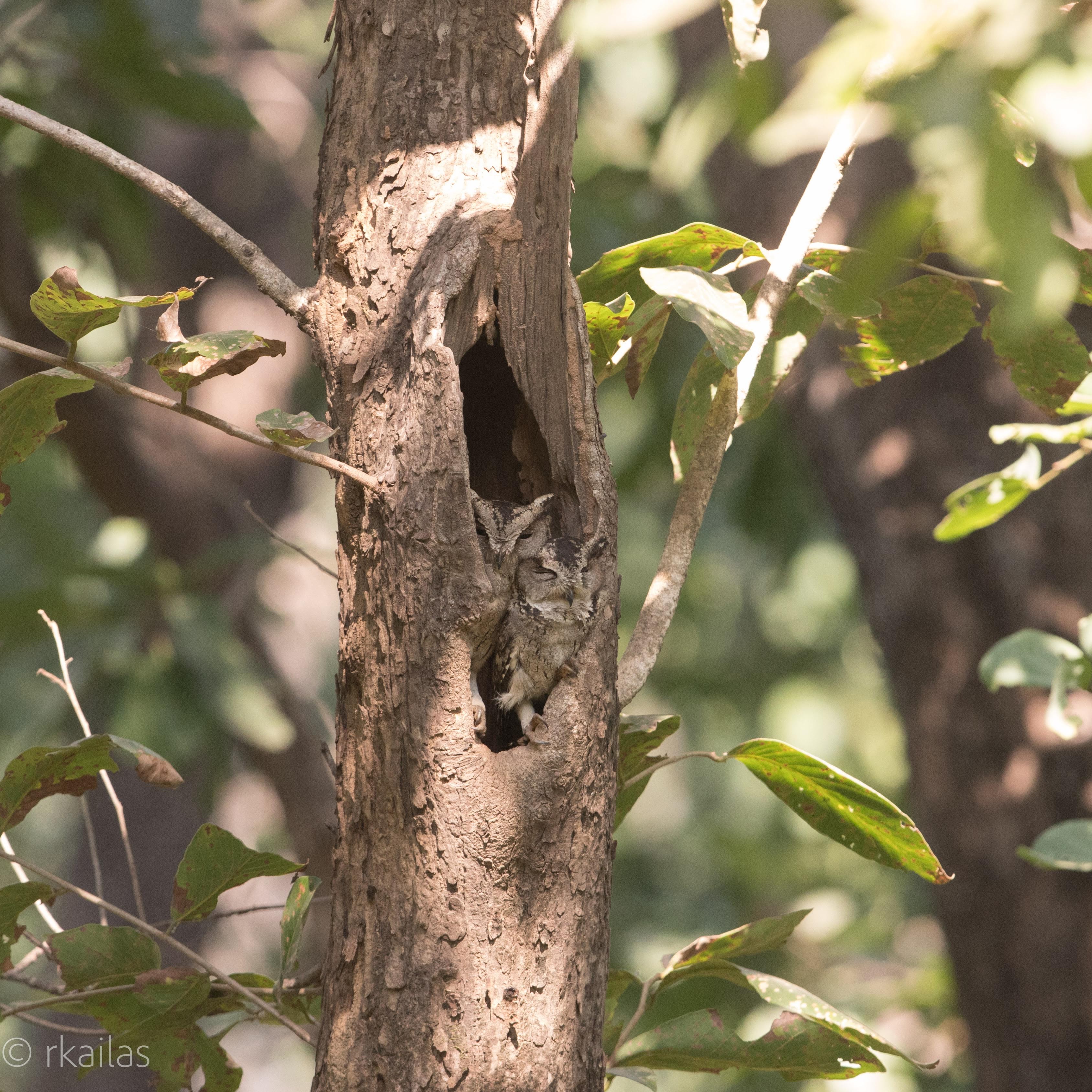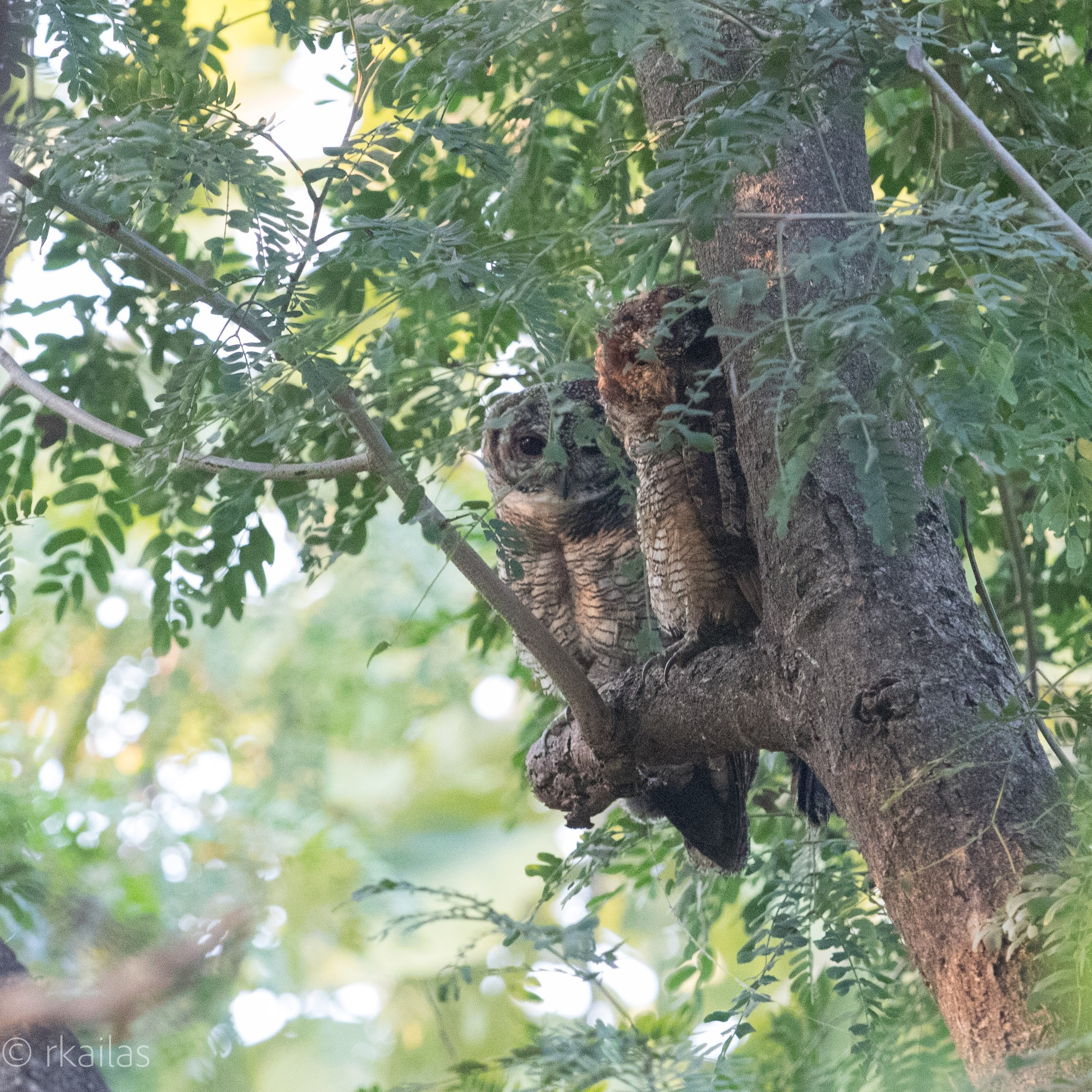 A pair of roosting Mottled Wood Owl in a young forest at Koka WLS