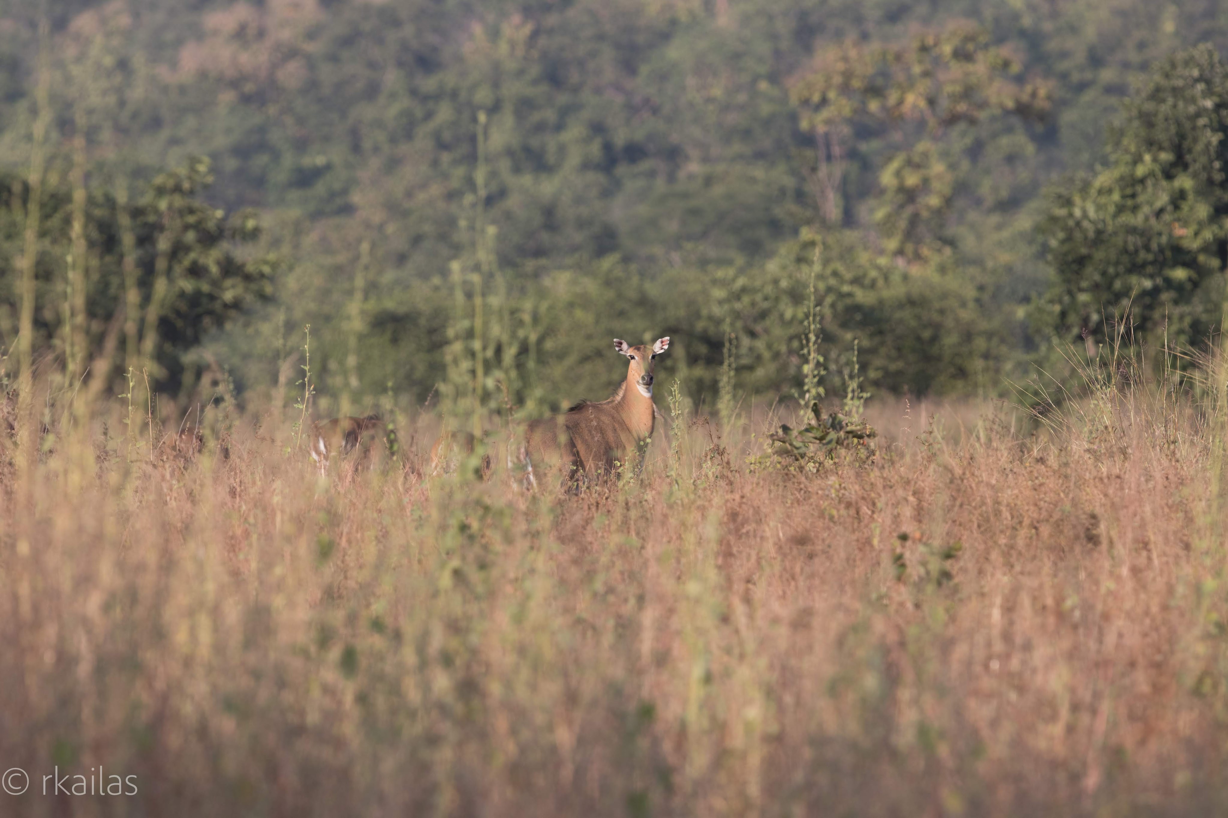 An early start to the evening safari to reach the gate to enter Koka WLS (a connected forest to NNTR). The drive through varied terrain took 1.5 hrs from the Nagzira Jungle Camp. The forest here was clearly more disturbed/sparser than at Nagzira, with seemingly younger monocultures of Teak, Garadi and Palash, interspersed with a couple of large water bodies surrounded by grassland. While, reputedly a good zone for Sloth Bear, mammal sightings were poor here, with just a few langur, a solitary Chital and 2 Nilgai (we did see Leopard and Wild Dog spoor though). Birdlife was interesting with sightings of White-eyed Buzzard, Mottled Wood and Indian Scops Owl, White-browed Fantail, Black-naped Monarch and Red-breased Flycatcher among commoner species.