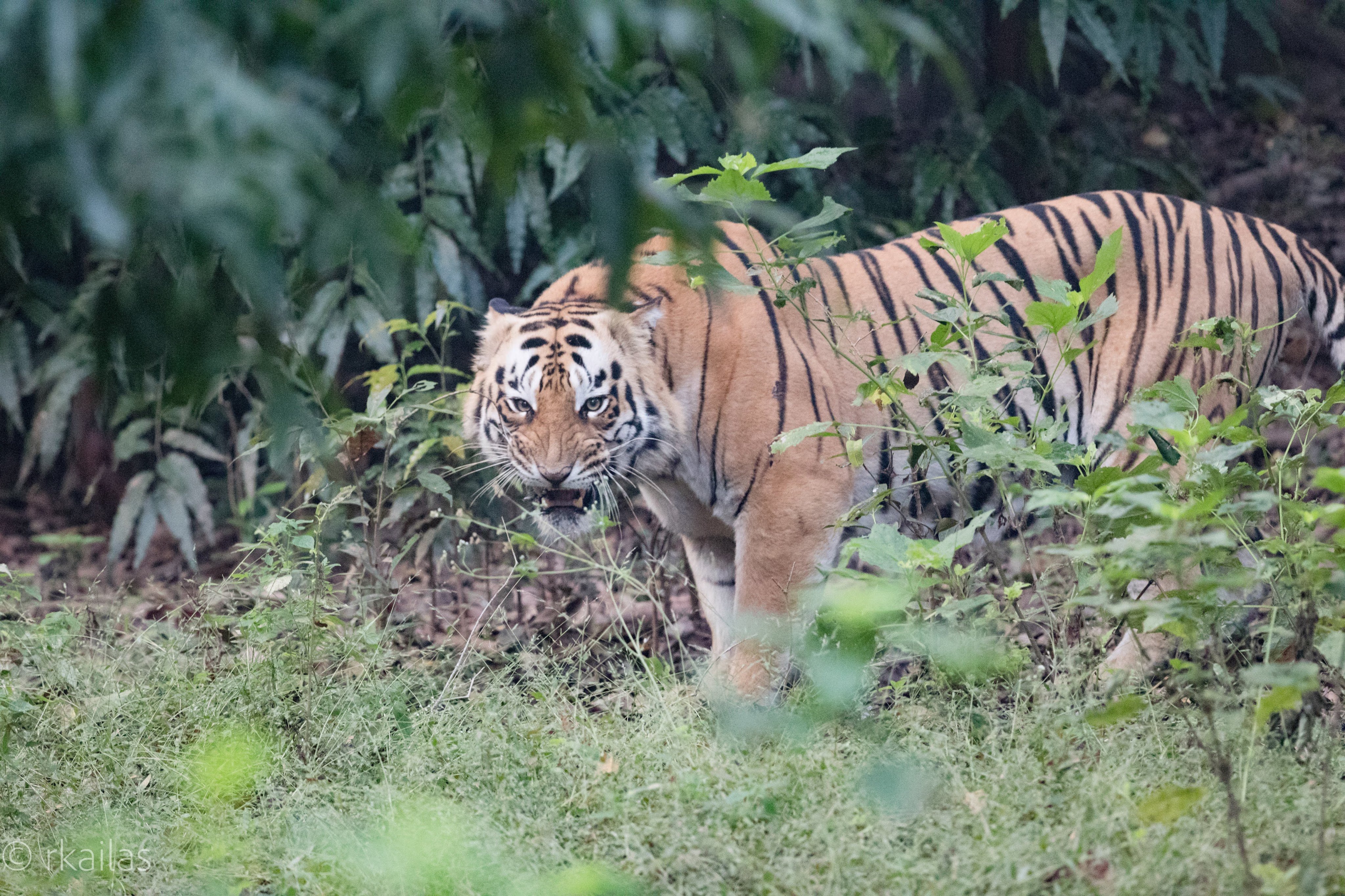 A foggy start to the morning – ours being the only vehicle at the Chorkamara gate (entrance to Old Nagzira) at opening time. There were undisturbed pug marks/spoor on the road this morning (Sloth Bear, Leopard, Jungle Cat), possibly from overnight or earlier, given the previous day was a weekly ‘no safari day’ in this zone. After a quiet ride, charmed by the early morning forest, blissfully sans other tourists, a Brown Fish Owl showed up around one of the overflow streams from the reservoir at Centre Point. Prompted by the driver, turning to the other side, just about 50 feet away, an adult tigress lying on the grass! The animal, stayed put in the open but was was obviously wary of our presence. Strange grunts emanated from the undergrowth, followed by the male – quite agitated apparently on having their privacy disturbed. A mating pair, wary (the male especially nervous) largely remaining in the vicinity, until more vehicles piled up noisily, chasing the pair away deep into the undergrowth, to culminate among the most personally satisfying tiger observations thus far. Further on, the safari continued off the beaten track onto a hilly, very scenic route (Satmudi towards Murpar Gate) from Circle Road. The aside complete, there was not much much luck barring commoner birds and mammals seen on earlier outings.