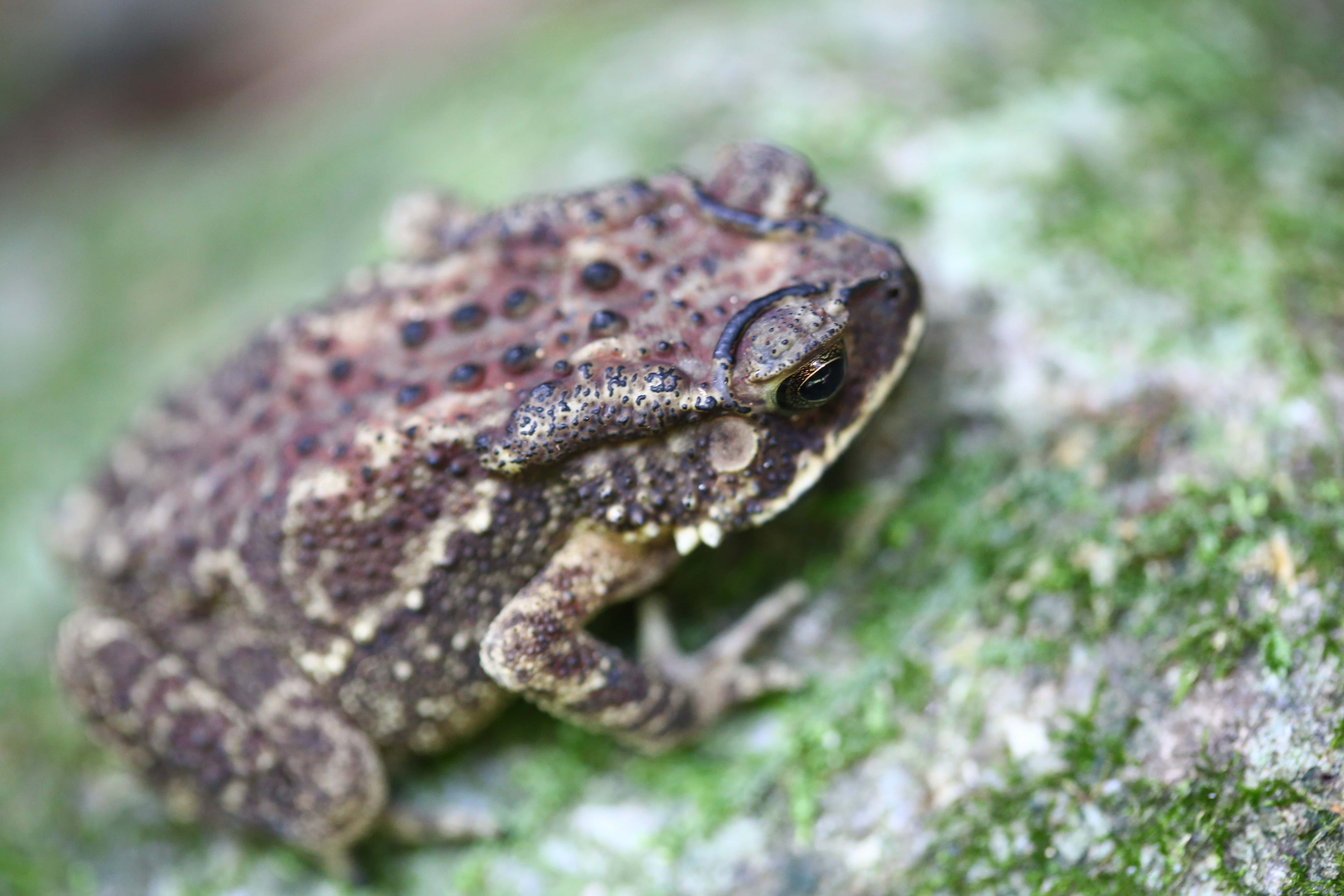 Another location where I spent quite a lot of time in was in the rainforest-plantation matrix above the Manjolai Estate, in the Kuduraivetti-Upper Kodayar belt, south of the Mundanthurai Plateau. This relatively high-altitude location (the landscape ranging from about 800m to 1500m), often dramatically scenic (especially in the mist shrouded shola-grassland like landscape beyond the Upper Kodayar Dam), turned out to be among the best places to see a variety of mammals in the park. Forays into the large open areas of natural grasslands and tea-plantations, interspersed with rainforest would produce several Gaur and Sambar, Indian Munjtac and Nilgiri Langur but my sightings have also included Elephant, Leopard, a (doubtful) sighting of a Tiger, Nilgiri Tahr (regular around the winch point at Nalamukh), Lion-tailed Macaque (regular at the entrance to the Manjolai Estate) and, rarely, Brown Palm Civet. There was great birdlife too, especially interesting in the montane locations, where I saw range restricted species like Ashambu Laughingthrush, White-bellied Sholakili and Broad-tailed Grassbird, among a healthy mix of birds typical of monsoon forests of the southern Western Ghats. The rainforest locations (Kakachi, a prime example) abounded with herpetofauna, especially along little streams, filled with a variety of frogs and a peppering of Malabar Pit Viper. There were also a few records of the Large-scaled Green Pit Viper from my time here, including one about 20ft up on a tree, a species of Sheildtail snake and a Beddome’s Tree Toad – all among the highlight herpetofauna from this location. Despite the wildlife riches, the main attraction of this landscape was the aesthetic beauty of its fern/epiphyte filled, relatively undisturbed rainforest of mature trees, leading into the mist shrouded montane forest/grassland ecosystem, reminiscent of high-altitude locations further north in the Western Ghats. In my time in this part of the park, I stayed at the pleasantly located within an open grassland, with magnificent views to the mountains and valleys of the range, Kuduraivetti Guest House. As with all others of its kind the FRH was in a state of disrepair, but not quite the wildlife haven (no sloth bears and the like spending the night within its walls) as some of the others located amidst dense forest. One of the practical upsides of this landscapes is the road network connecting the settlements, hydro-electric infrastructure, and plantations, that passes through the natural areas, providing for easy access to explore the large parts landscape.