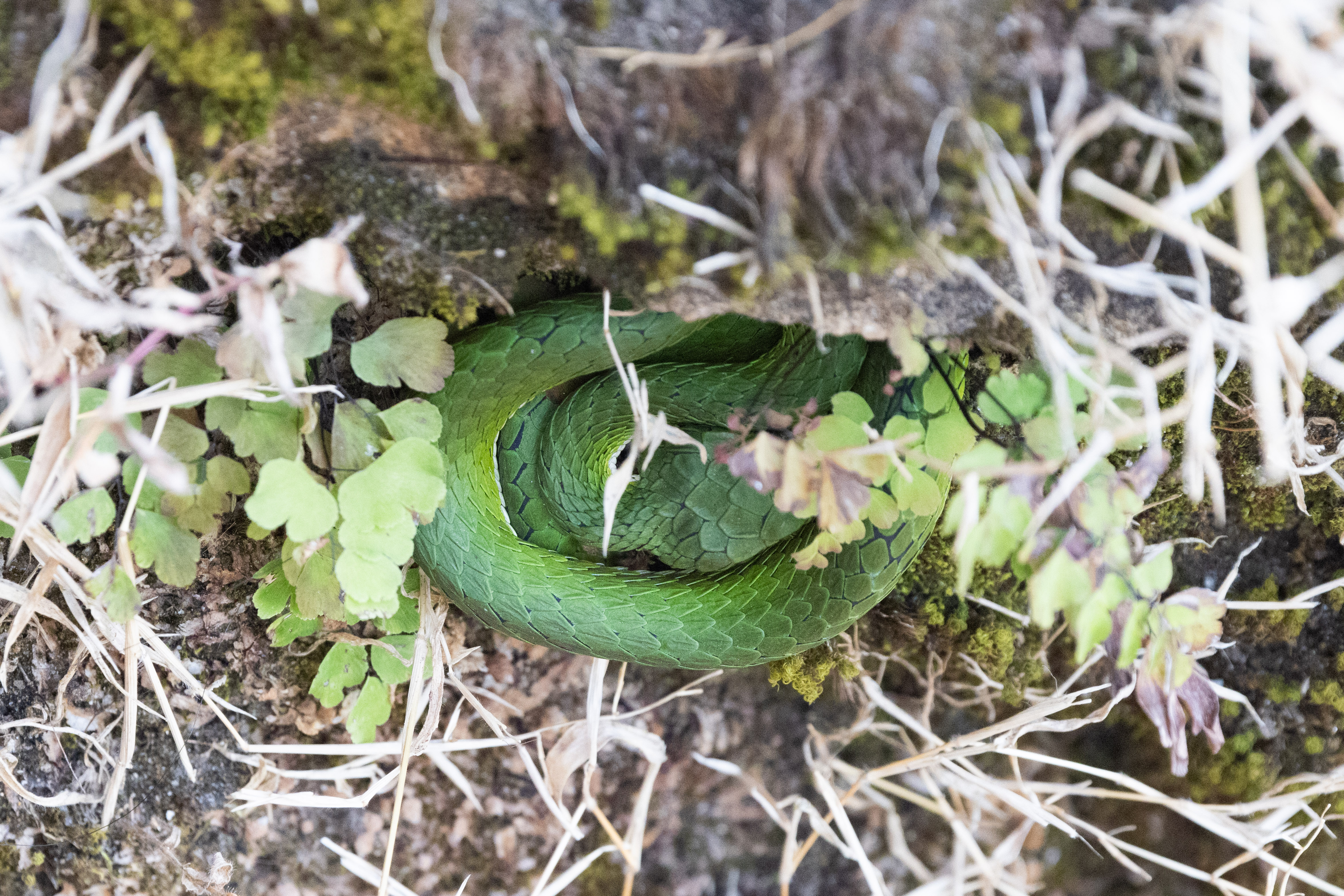 Two nights basing ourselves at the Talayar Tea Plantations, gave us access to the dry/riverine forests at Chinnar and the montane habitats around Munnar. An evening effort at Chinnar, after much looking, was successful for the patchily distributed Grizzled Giant Squirrel, including of an individual feeding on a road-side fruiting tree, late in the evening. This dry habitat also produced Tufted Grey Langur, which can only be seen in the lower Eastern slopes on these mountains. Our morning effort at the very touristy Eravikulam did produce Nilgiri Tahr, but we only saw them on distant ridges (bad luck, as herds often walk right upto tourists here). Concerted effort to find Nilgiri Striped Squirrel in the montane patches at Eravikulam (and later in the evening, in a nearby patch) proved futile for this shy, diminutive species. The only other diurnal mammals that showed were Malabar Giant Squirrel, Nilgiri Langur, Asian Elephant and Indian Palm Squirrel – the latter two as we were climbing up towards Chinnar, from the plains. Eravikulam also produced a basking Large-scaled Green Pit Viper – the only significant reptile from the trip. A little night effort around our accommodation produced fleeting glimpses of Indian Porcupine, Indian Chevrotain, Wild Pig and Brown Mongoose one evening, and loud sounds, apparently emanating from a stand-off between Leopard and Wild Pig on the other.