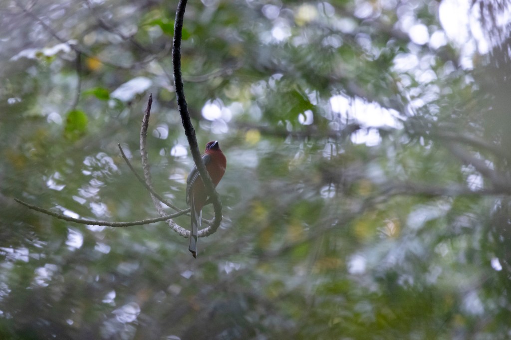A full session (the park opens around sunrise and shuts by 2 PM), followed by a brief morning session at the tiny, but engrossing lowland forest of the Hollongappar Gibbon Sanctuary was (as expected) productive for several Western Hoolock Gibbon families, feeding, filling the air with their haunting calls and otherwise going about their business in the morning, but just a solitary male Pig-tailed Macaque, a troop of Rhesus Macaque and Capped Langur each, otherwise. While our local guides, led by the excellent Diganta Gogoi, put in much effort to look for Stump-tailed Macaque, this enigmatic primate proved elusive (a species that despite its large troop sizes here, and tell-tale feeding habits, are difficult to locate even in this small patch of forest, spending much time hidden in the dense undergrowth). The other mammals that showed in relative abundance were Orange-bellied, Pallas’s and Malayan Giant Squirrels. Red-headed Trogon, Dollarbird, Abbot’s Babbler and Greater-necklaced Laughingthrush were among the bird highlights, but dedicated efforts should unravel many more regional specialities in this promising patch. Some evening and night effort in the countryside surrounding the Gibbon Homestay, our pad for these two nights, produced interesting birds like Eye-browed Thrush and Banded Bay Cuckoo and revealed promising habitat for Fishing Cat, but not the animal itself. While reputedly common residents in the countryside around here, we also missed seeing Leopard in our efforts after dark.